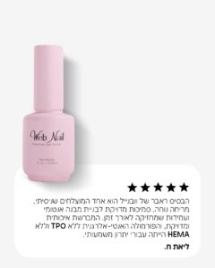 התאמה למגוון חומרים – נוזל אקרילי עובד היטב עם מגוון מוצרי ציפורניים, כולל נצנצים, פיגמנטים ואלמנטים דקורטיביים, ומבטיח חופש יצירתי רב.